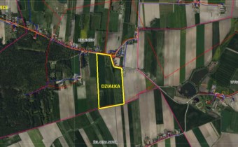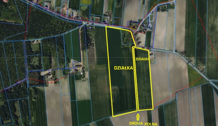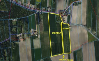 0,5 ha. przy drodze powiatowej to obszar zadrzewiony z budynkiem mieszkalnym do rozbiórki lub remontu.
